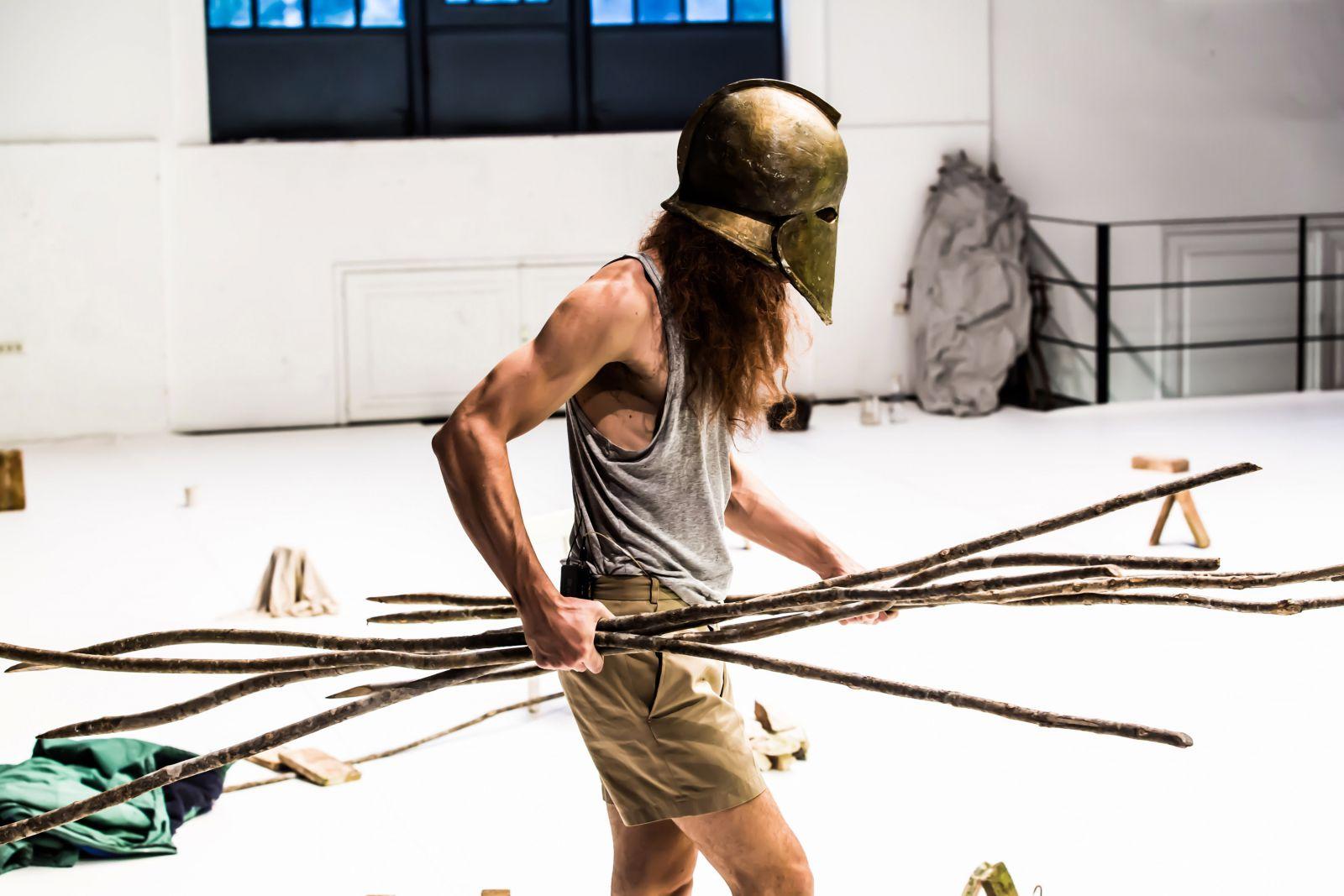 “On the stage, Matija Ferlin is a kind of god – moving around objects, he resembles a child at play who is creating their own worlds locked in their world. At the same time, he is also on stage as a person who should be embodying all characters of the Antigone through texts, but never really is due to the never seen action of pronunciation.” Maša Radi