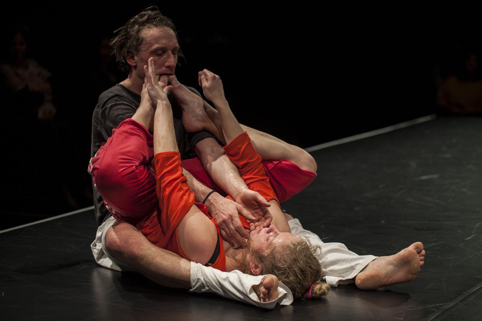 The performing duo Jurišić–Mandić, in collaboration with director Bojan Jablanovec and writer Semira Osmanagić, addresses the timeless ideal of performing arts and the eternally unsolvable issue of politics: what does it mean to be together, and how to be together. Marko and Leja turn this question upon themselves: why do I want to be together, how to endure being together, what to do (with oneself) so that “together” becomes a realization of a surplus (me), how to avoid the hierarchy of power. And how to establish this “together” in the performative time and space of the spectator. “Together” is a sort of a mythical site of fusion that “heals” an individual with another individual. To do this, they need time. The gaze of the third seeking its own place in togetherness, entering the performance through the thoughts of Semira Osmanagić who interprets with words and pushes the doorknobs of invisible doors into the “together”. “Together” requires an investment that is increasingly difficult to pay. “Together” is a surface which is always slippery. An unsolvable problem for politics, an eternal ideal for performing arts.