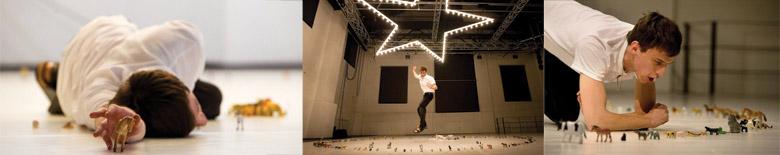 Matija Ferlin is a dancer and choreographer who finished his choreography and dance studies at the SNDO in Amsterdam. In addition to collaborating with several authors (Maja Delak, Ivica Buljan, Ame Henderson, Sasha Waltz, Keren Levi, Martin Bulter, David Zambrano, Mauricio Ferlin), he also creates his own performances, short films and expositions. He lives and works in Pula, Croatia. We have had the occasion of seeing him in Slovenia in his solo SaD SaM (revisited) and in Maja Delak’s performances Rodeo and Serata Artistica Giovanille.Perfromance SaD SaM /almost 6/ is the continuation of Ferlin’s cycle of solos SaD SaM. The first solo SaD SaM (Now I am) was created in 2004, the second one SaD SaM (revisited) in 2006. In SaD SaM /almost 6/ Ferlin simply resides on stage, he possesses a natural presence rounded by his boyish appearance and the impression of sincerity when we follow him through humorous as well as painful situations. Self-sufficient and relaxed, he passes paraphrasing pop to the direction and choreography-wise perfect interaction with plastic figurines that at the same time represent his drama characters and his ensemble.